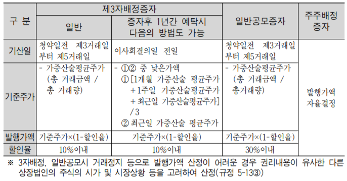 유상증자로 인한 기존 주주의 피해를 막기 위해 신주 발행 시 할인율은 제3자 방식의 경우 10% 이내로, 일반공모의 경우 30% 이내로 제한하고 있습니다.