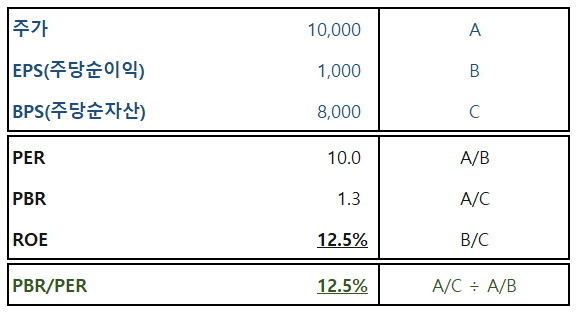 이를 다른 산식으로 하면 EPS/BPS가 되고 이는 곧 PBR/PER이 되는 셈입니다. 복잡해 보이지만 결국 아래와 같은 단순한 곱하기와 나누기입니다.